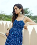A beautiful ethnic printed dress in blue with a ravishing neck and a flared, flowy and mildly dramatic silhouette is perfect for a casual evening look.