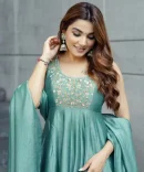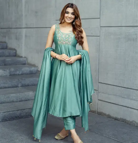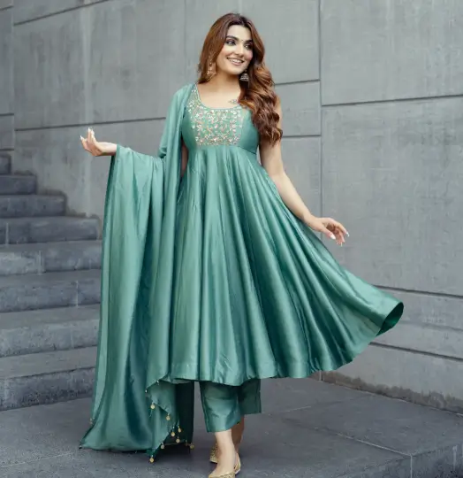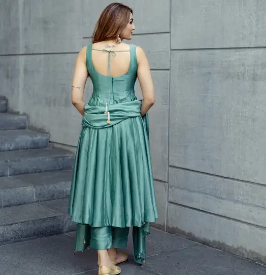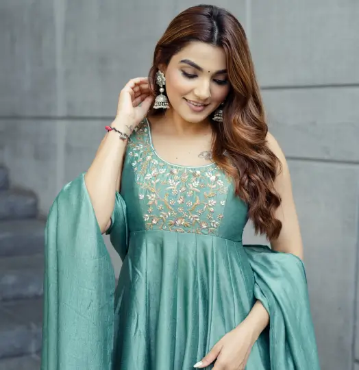 Wrapped in elegance, draped in serenity. The enchanting emerald hue, delicate embroidery, and fluid silhouette make every twirl a statement of grace.