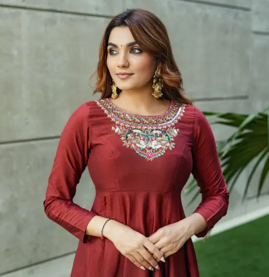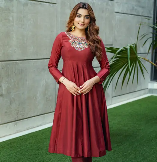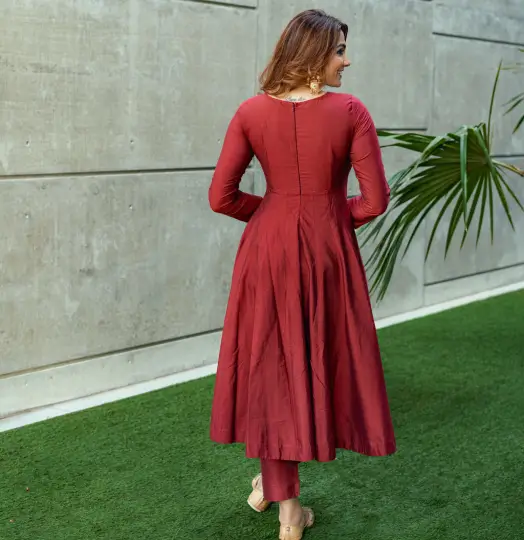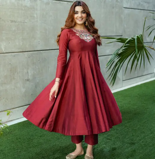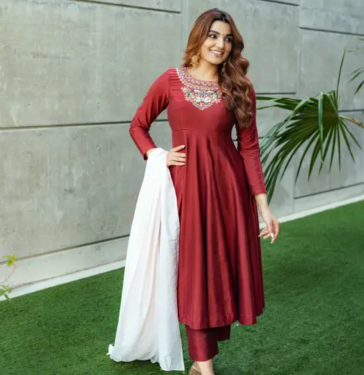 Step into timeless elegance with Scarlet Bloom, a stunning maroon kurta set adorned with intricate multicolored floral embroidery on the neckline. This outfit exudes grace with its flowy silhouette, crafted from premium fabric that ensures comfort and style.