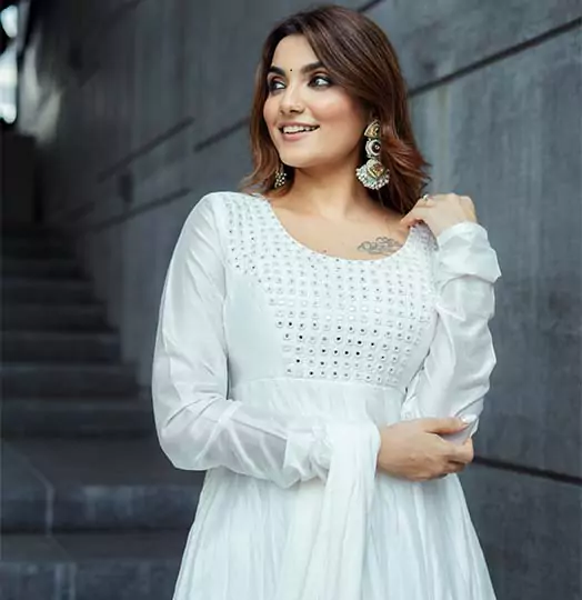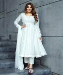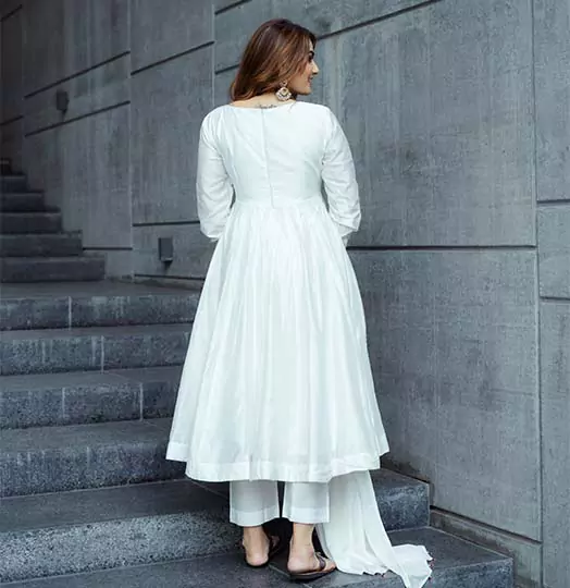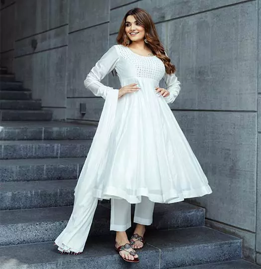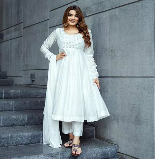 White anarkali set, featuring mirror-work bodice
